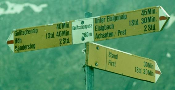 Der etwas ramponierte Wegweiser hätte uns eine Warnung sein sollen. Statt schnell hinunter nach Elsigbach zu marschieren, das Wetter drohte nereits ein wenig, sind wir gemächlich vom Elsighorn zum Golitschenpass und dann langsam hinunter nach Kandersteg gewandert.