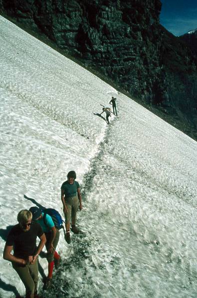 Ehe der Gletscher betreten werden kann gilt es erst dieses Schneefeld zu queren. Ein Fehltritt könnte fatal sein, da am Ende des Schneefeldes ein Abgrund wartet.