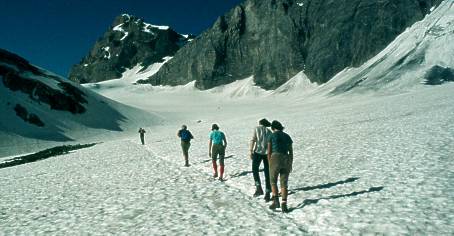Über die weiße Fläche hinauf bis zur Lötschenhütte, damals, 1980! Bereits etwa 10 Jahre später war der Gletscher nicht mehr begehbar. Der Weg wurde nach links in die Felsen verlegt.