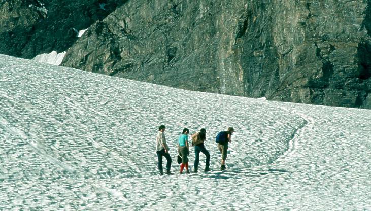 Kein besonderes Bild. Sollte ich es kleiner machen um WebSpace zu machen? Das wollte ich eigentlich nicht. Zeigt das Bild doch, wie weit der Weg über den eben noch einfach zu überblickenden Gletscher ist.