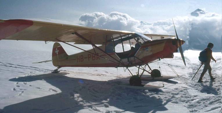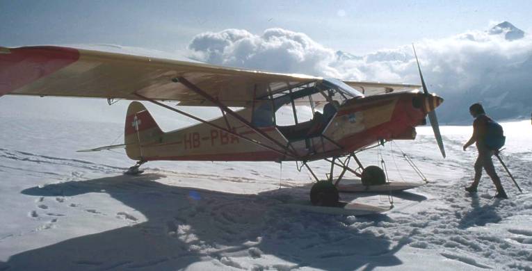Dann kommt das Gletscherflugzeug. Der Pilot steigt aus nimmt Pickel und Rucksack und marschiert davon.
