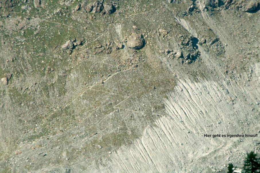 Da geht es wieder hinauf. Es fehlt jegliche Markierung.Aus der Ferne betrachtet, ist der Pfad hinauf nur schwer auszumachen, der Teil im Schotter nicht zu erkennen.