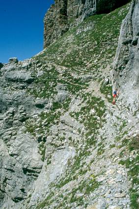 Wer auf schmalem Pfad da hinüber steigt, sollte natürlich vorsichtshalber den Berg festhalten oder ...