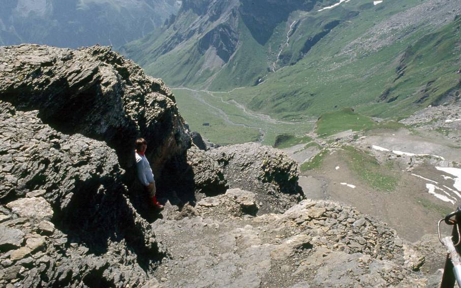 Noch lange nicht oben. Was drückt die Wanderin an den Felsen? Angst wegen des Tiefsblicks oder die Strahlen der Morgensonne?