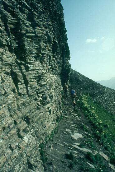 Keine Markierung! An den Felswänden ist entlang zu marschieren bis Pfadspuren zu erkennen sind, die hinauf führen.