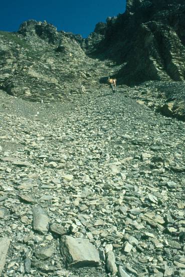 Dann geht es in der dritten Rinne in lockerem Gestein auch gleich richtig hinauf.