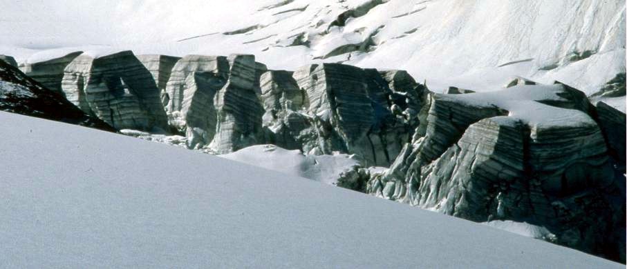 Auf dem Blümlisalpgletscher Eisblöcke wie ausgesägt. Im Hochsommer sogar mit Neuschnee bedeckt.