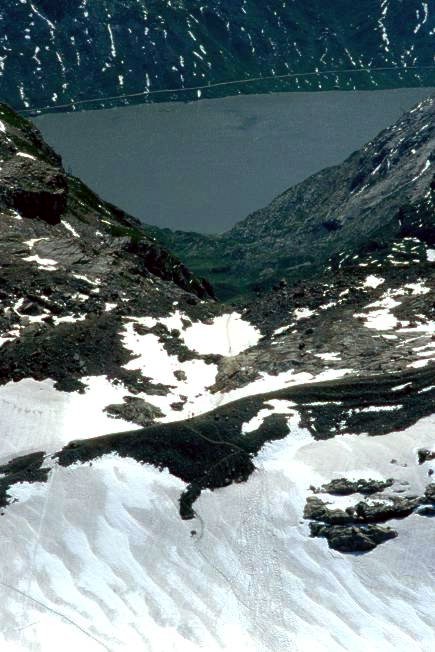 Wegspuren weit, weit unten.Sollte das der Daubensee sein?