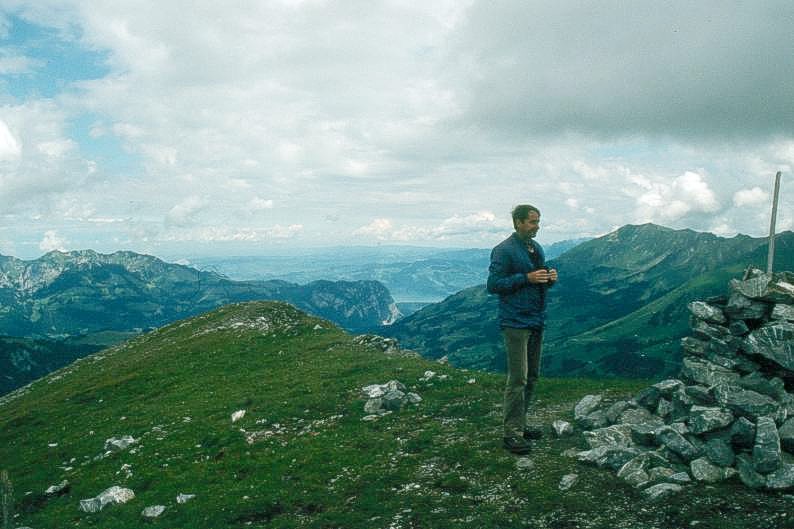 Schon steht der Wanderer auf einem Gipfel. Hinten unten der Thuner See. Wo mag dieser Gipfel wohl sein? Zwischen Niesen und Stockhorn ist er zu finden, wenn ich mich recht erinnere.