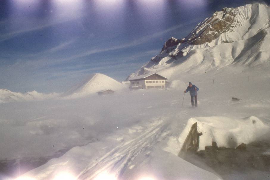Sturm auf Engstligen, da scheint die ganze Welt in Bewegung. Skifahrer, siehst du Fahnen am Wildstrubel, frage bevor du zahlst, hat es Wind auf der Engstligen? Auch 2002 war da noch so etwas angeschrieben, wie “kein Geld zurück”. Ob die Information für den Bergfahrer besser geworden ist, kann ich nur hoffen. Mich haben sie mindestens dreimal bei Sturm da hochfahren lassen - ohne Geld zurück! Natürlich hätte ich dann auch diese schönen Erinnerungen nicht. Foto Klopfenstein, Adelboden, wäre bei diesem Wetter da nicht hinauf.