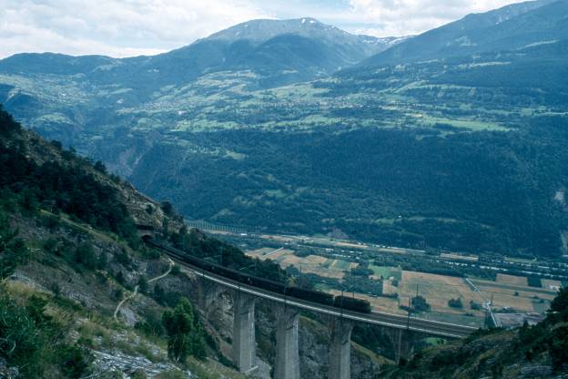 Über das Luogelkin-Viadukt geht der Blick hinunter in das Rhonetal. Waren diese Wanderer denn schon wieder auf der Südrampe? Nein, sie waren auf dem Prag.
