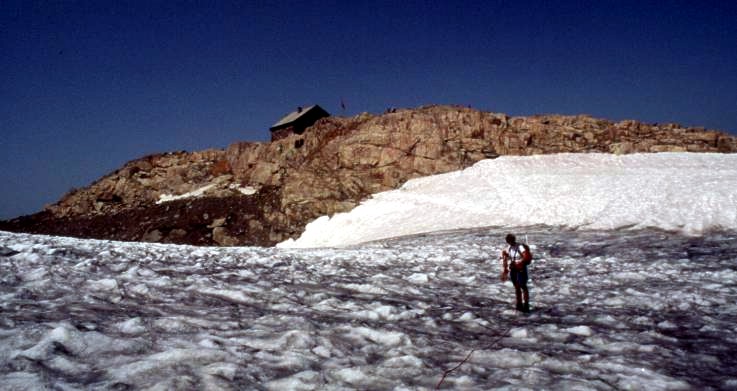 Gleich hinter der Hütte ginge es natürlich weiter. Doch nur für richtig ausgerüstete Hochalpinisten.