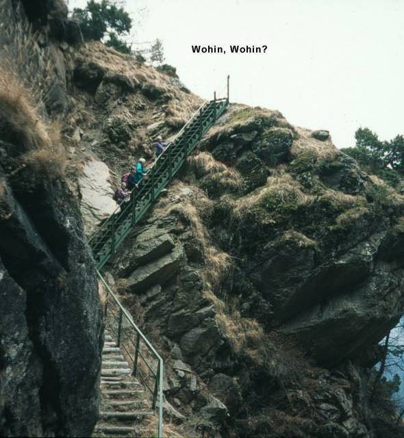 Hinauf, immer wieder auch hinauf. Fast bequem ist diese Treppe, doch auch ganz schön luftig. Und nur der Anfang einer längeren Steigung.