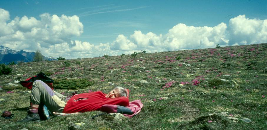 Im Mai oberhalb der Naturnser Alm sind die Wiesen übersät mit lilafarbenen Polsterstauden.
