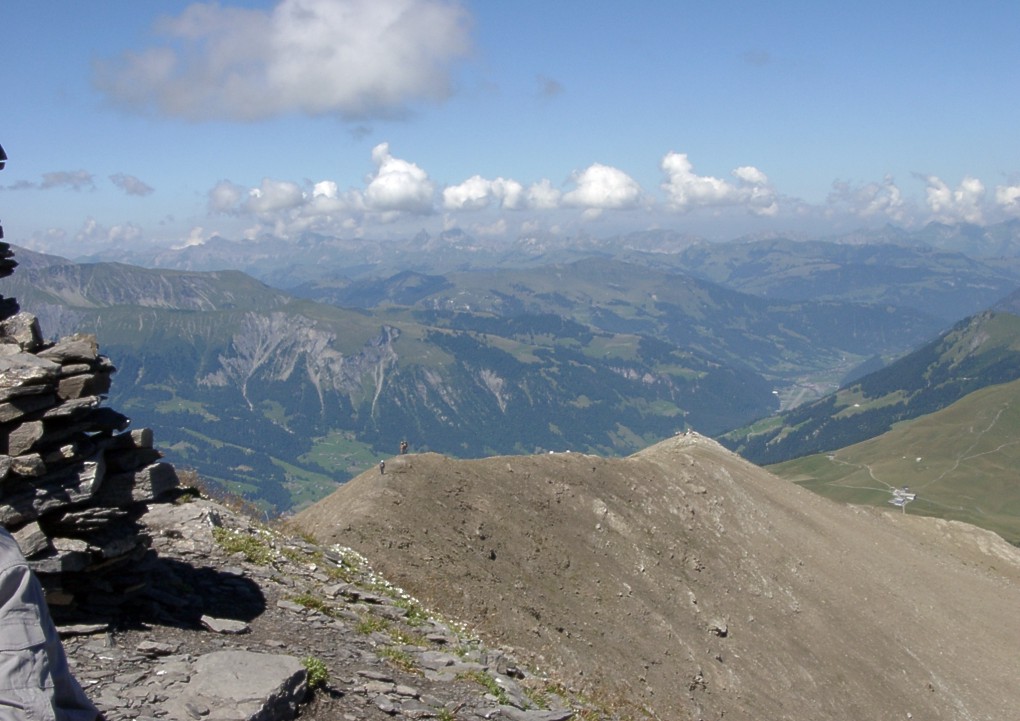 Über diesen Grat geht es auf einem neuen schönen und mitunter etwas luftigen Bergweg hinunter zum Hahnenmoospass. Die Gebäude auf dem Pass sind rechts zu erkennen.