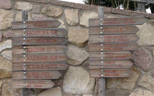 Auf Meran 2000 - Schilder, Schilder, da ist für jeden etwas dabei. Da kann der Wanderer eine Weile laufen bis er überall war, bis er alles kennt. Sogar der Hirzer ist hier angeschrieben. Wie weit mag es sein?