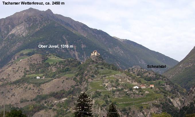Berge über Naturns: Zuerst ist da der Hochwarth, 2608 m, zu nennen. Mehrfach waren wir schon oben. Dann gegenüber die Kirchbachspitze mit 3053 m, zweimal waren wir schon oben. Doch wie ist das Tscharser Wetterkreuz zu bezwingen?