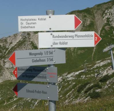 Neue Schilder hat der Berg. Doch sind sie besser geworden?Unten an der Station steht nur “Großer Daumen”, hier ein wenig höher, ist das Giebelhaus hinzugekommen. Marschzeiten? Selbst erproben!