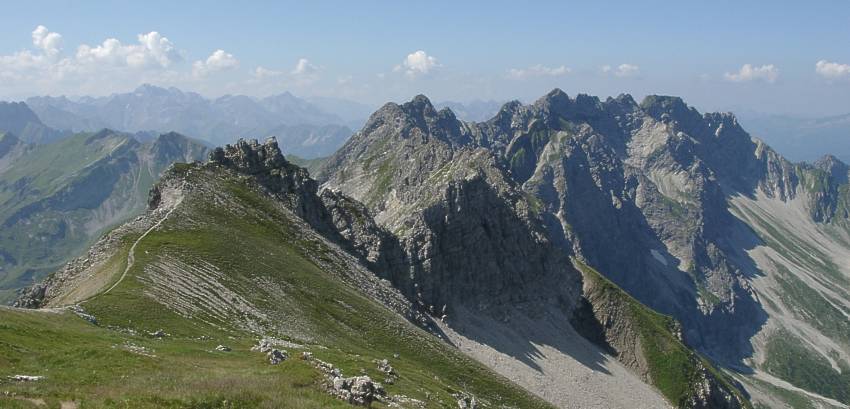 Auf dem Großen DaumenDer Pfad unten links ist das “glückliche” Ende des Hindelanger Klettersteigs. Über die vielen Gipfel rechts marschieren sie heran, die Kletterer.