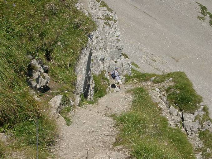 Gern hält sich der Wanderer am Drahtseil fest, wenn er hinunter blickt.