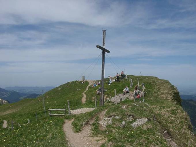 Stuibengipfel Tatsächlich ein Grashügel. Doch wer weiter will zum Hochgrat hat nach den drei Stunden vom Mjttagberg zum Stuiben noch vier Stunden bis zum Hochgrat und wer zum Mittagberg zurück will, hat wieder dieses Stück Fels und noch ein paar am Drahtseil zu überwinden.