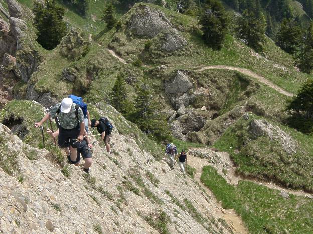 Am Drahtseil richtig hinauf (oder hinunter), ein prächtiges Pfädlein, fast stets auf dem Grat und nur drei Stunden von der Bergstation Mittagberg zum Stuiben. Wer wollte da nicht mit?