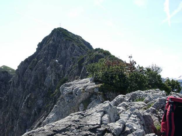 Zum Geißalphorn nur für Geübte! Gleich hinter den Latschen gibt es ein Stück Grat. Tiefsicht nach links und rechts, kein Pfad, kein Stück Seil zum Festhalten, auch kein Hinweis am Pfadbeginn (außer dem seltsamen Schild, da nicht abzusteigen)! Das ist etwas überraschend nach dem gut ausgebauten Weg hinauf und hinüber zum Rubihorn.