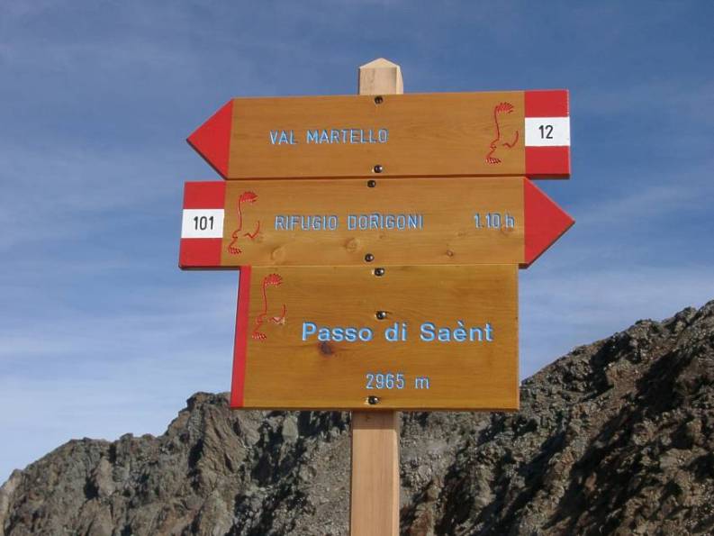 Wer diese Schilder lesen will, hat vom hinteren Martelltal 4 1/2 Stunden aufzusteigen.oderWer seine Kondition testen will, kann zu diesen Schildern 4 1/2 Stunden hochsteigen.