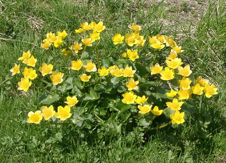 Butterblumen (sind es Butterblumen?) angeordnet zu einem Strauß.Sumpfdotternlumen?