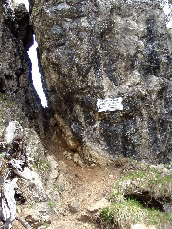 Weist die Beschilderung zum Durchgang durch diesen Spalt?Ich empfehle die Umgehung etwas weiter unten.