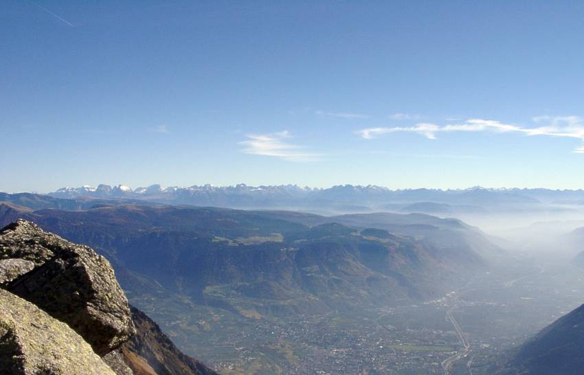 Auf dem HochgangpfadPrächtige Sicht gleich hinunter nach Meran. Bozen im Dunst.Wer mag an einem solchen Tag nach Hause gehen?