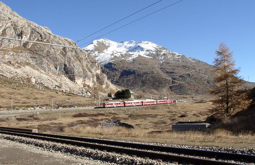 Da kommt der Bernina-Express den Pass hinunter - von Poschiavo nach St. Moritz.