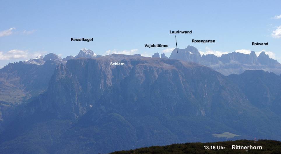 Beachten! Die Dolomitengipfel erst nachmittags fotografieren! Doch wenn die Ehefrau, die beste Ehefrau von allen, nach dem Einkauf um 1400 Uhr in Bozen vor dem Bahnhof wartet ist das für den Bergwanderer problematisch.