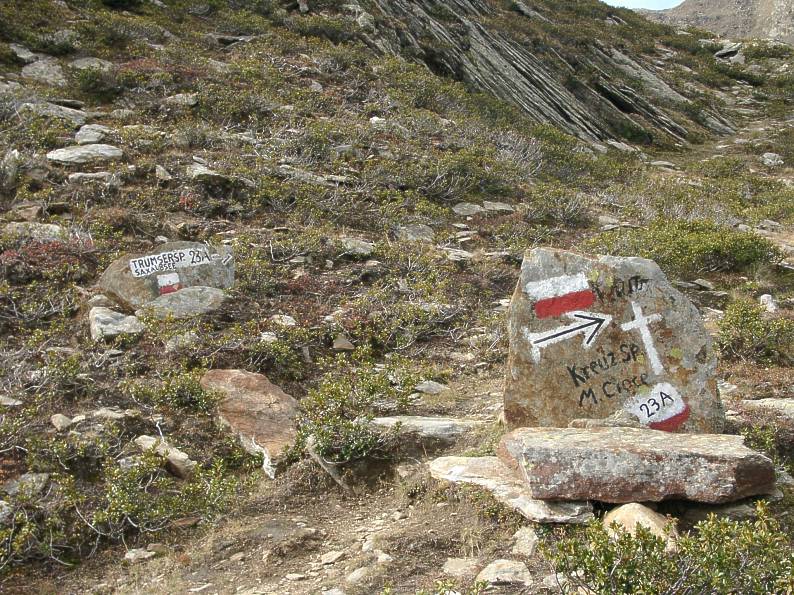 Karthaus- Klosteralpe, wohl einer der steilsten Hüttenaufstiege im Vinschgau. An diesem Wegweiser angelangt, ist es noch eine gute Stunde zur Kreuzspitze. Ob es vom oder über den Saxalbsee zur Trumserspitze markiert ist, gilt es noch zu prüfen.