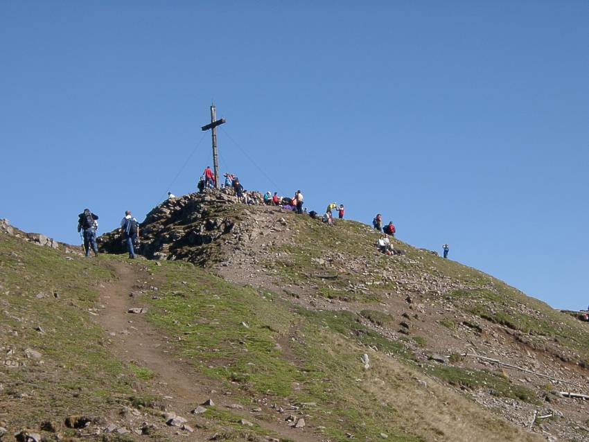 Laugenspitze. Nur ein Grashügel? Längst nicht so gefährlich wie die Hochgangscharte? Von wegen! Fast schon auf dem Gipfel hat ein Wanderer vor mir, der abseits des Pfades plötzlich eine Rinne hochkletterte, einen Steinschlag ausgelöst. Nur die schnelle Flucht hinter einen Felsvorsprung bewahrte mich vor blauen Flecken.