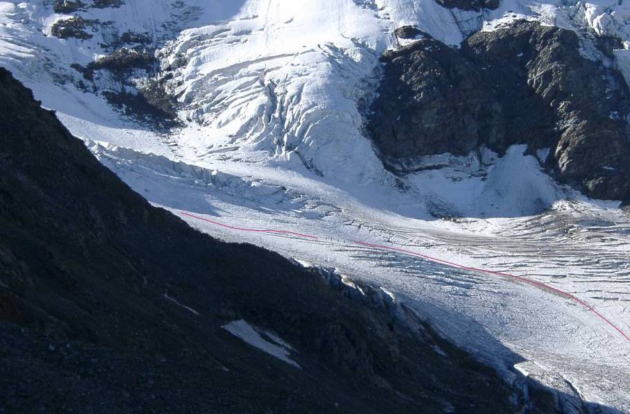 Langsam steigt ein Bergführer mit seinen Gästen gegen das Eisseejoch.