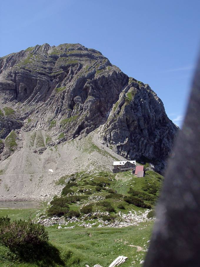 Hoch türmt sich der Wiedemerkopf hinter dem Prinz Luitpoldhaus auf. Doch auf den neuen Wegweisern bei der Hütte fehlt jede Angabe zum Weg hinauf. “Warum?” fragt sich der Wanderer. |