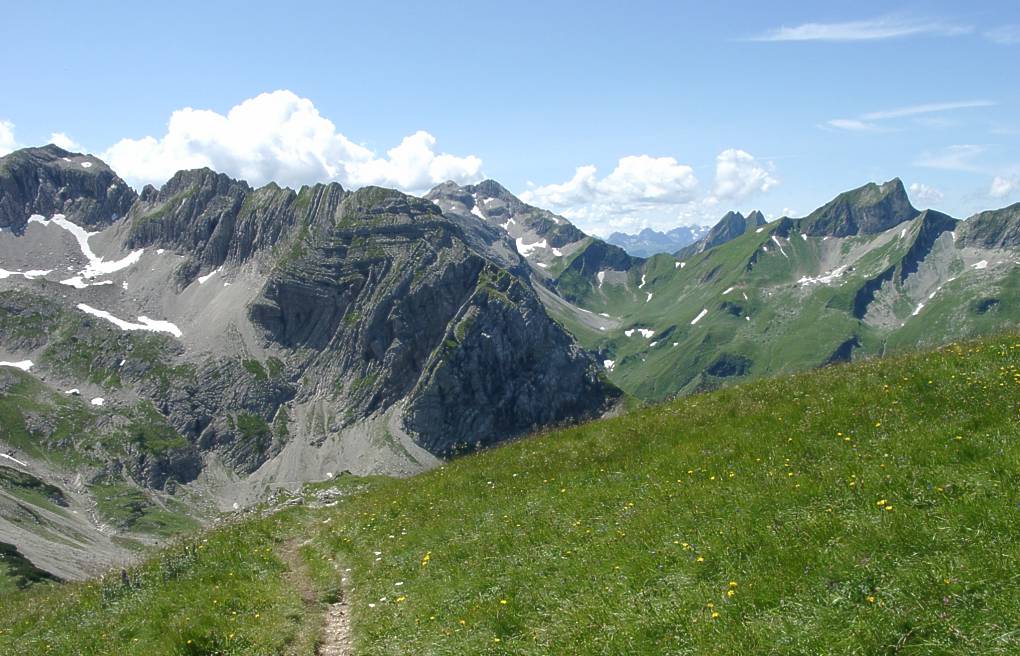Beim Aufstieg zur Bockkarscharte prächtige Aussicht in die vielen, vielen Allgäuer Berge.