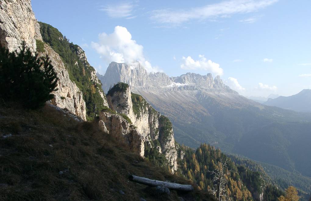 Vormittags im Gegenlicht war der Rosengarten kaum auszumachen. Doch Nachmittags wird er von der Sonne beschienen und der Wanderer kann alle Gipfel zählen.