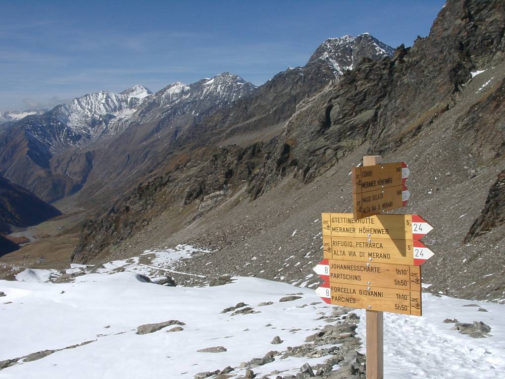 Stettinerhütte endlich ausgeschildert! Nur fünf Minuten! Doch ein Wanderer kam mir da bereits entgegen und sagte, dass die Passhöhe wegen gefrorenem Schnee nicht zu erreichen ist. |