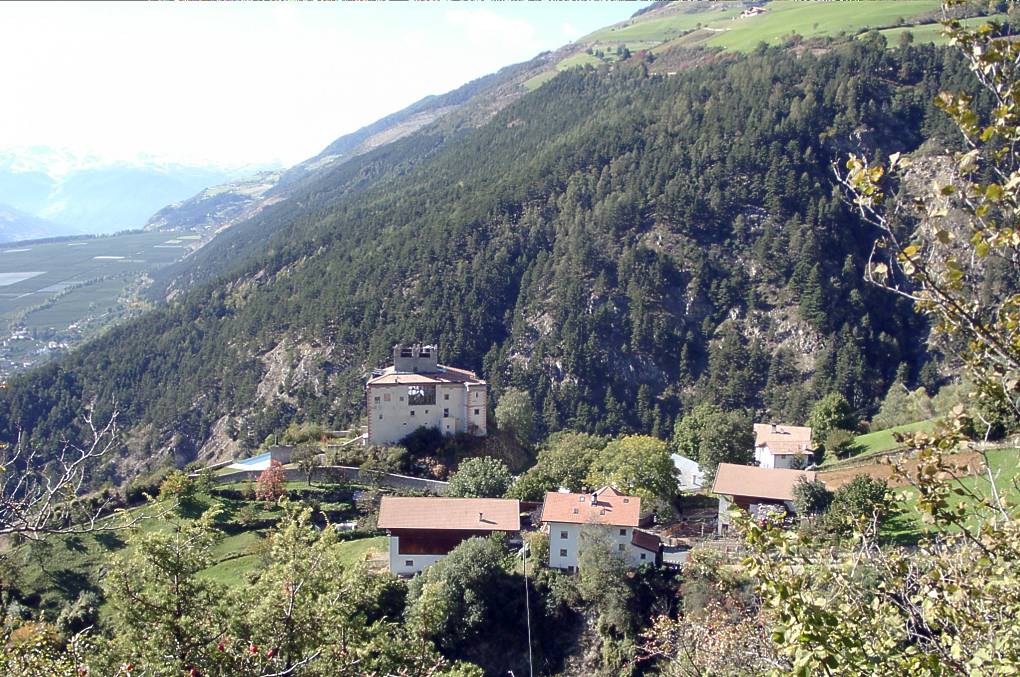 Hier kann der Wanderer wählen, -ob er direkt an dieser “Burg” über nackten Felsen in der Sonne nach Schlanders absteigt oder -ob er noch ein Stück den schönen Waalweg nach Kortsch benutzt und dann im Wald hinuntergeht. Karte benutzen, da schlecht ausgeschildert.