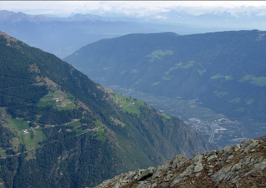 Viel besser als es dieses Foto wiedergibt ist der Blick hinüber zum Sonnenberg und in das Etschtal.