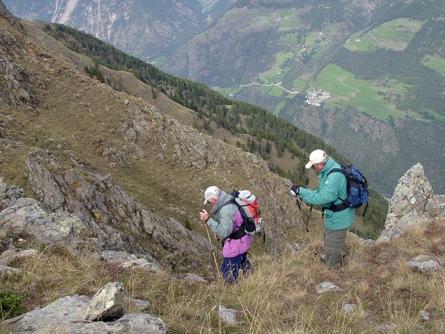 Hier sieht der Wanderer von 2400 hinunter bis auf die Schnalstalstraße. Wer da nicht schwindelfrei ist geht keinen Schritt weiter.