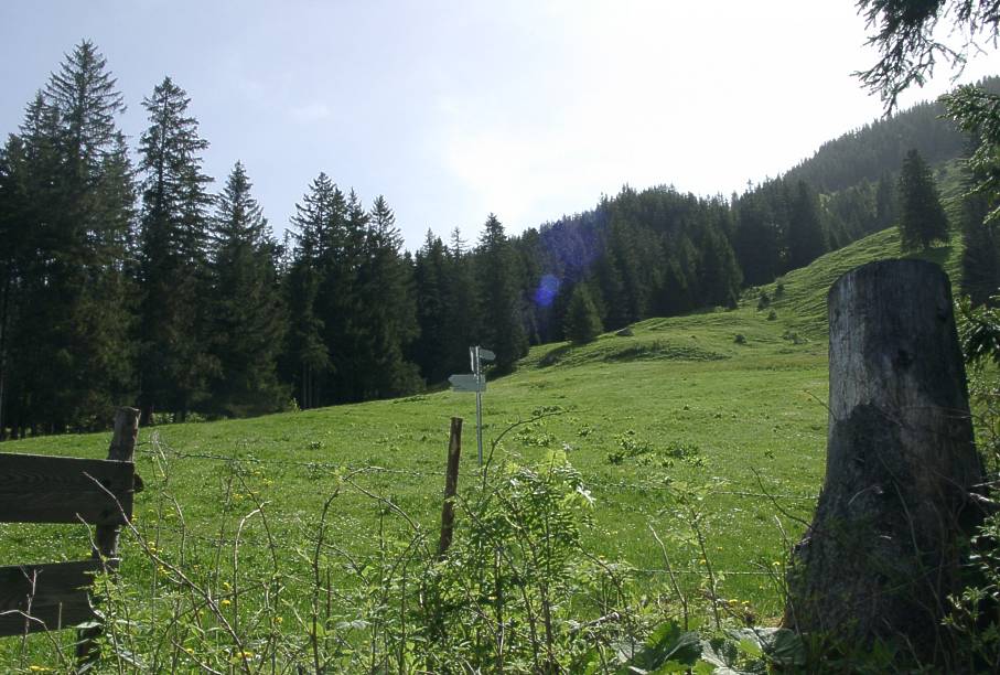 Nach etwa 45 Minuten verlässt der Wanderer den Waldweg und darf auf der Wiese den Pfad hinauf suchen.