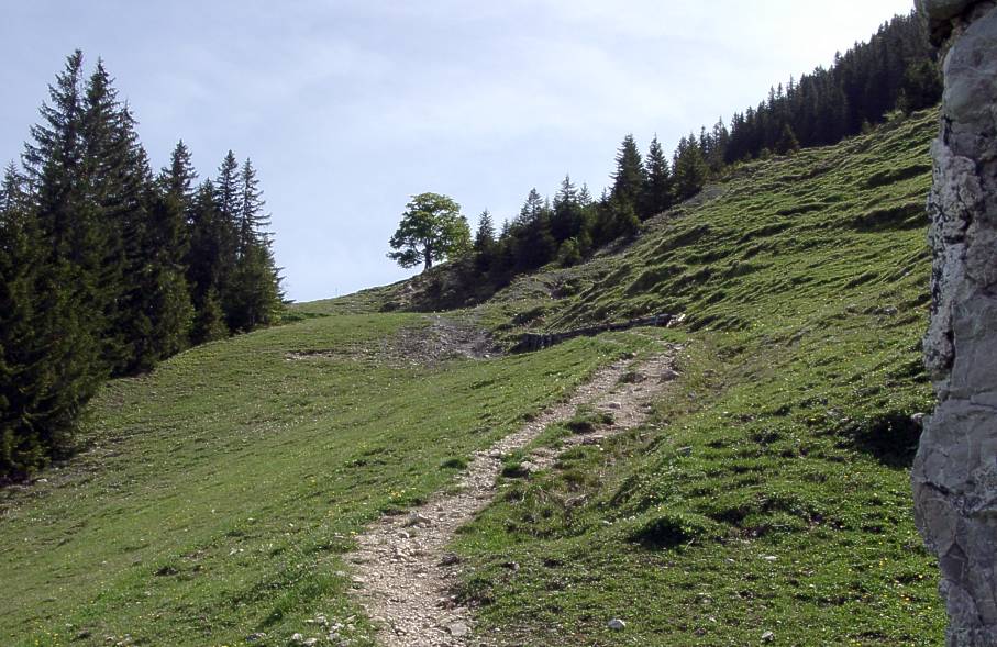 Hinter der Alpe Älpele geht weiter gut hinauf bis zum Waldrand. Dann wird es noch steiler.