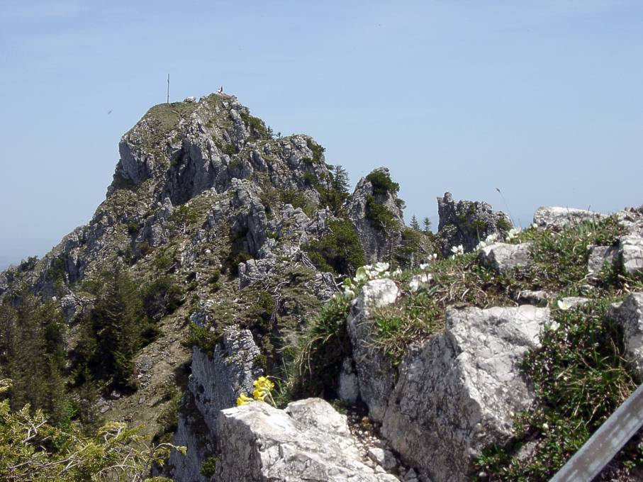 Vom Zinkengipfel geht es, wenn im Gipfelbereich die Drahtseile überwunden sind, auf unschwierigem Pfad hinunter nach Unterjoch. Vielleicht knapp eine Stunde und dreißig Minuten. |