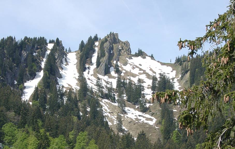 Steineberg, ein Gipfel in der Nagelfluhkette. Vom Parkplatz vor der Gunzesrieder Säge “nur” zwei Stunden. Ende Mai gilt es, noch Schneefelder zu queren! Doch Flühblumen hat es auf dem gesamten Gratweg über den Stuiben bis zum Hochgrat. |