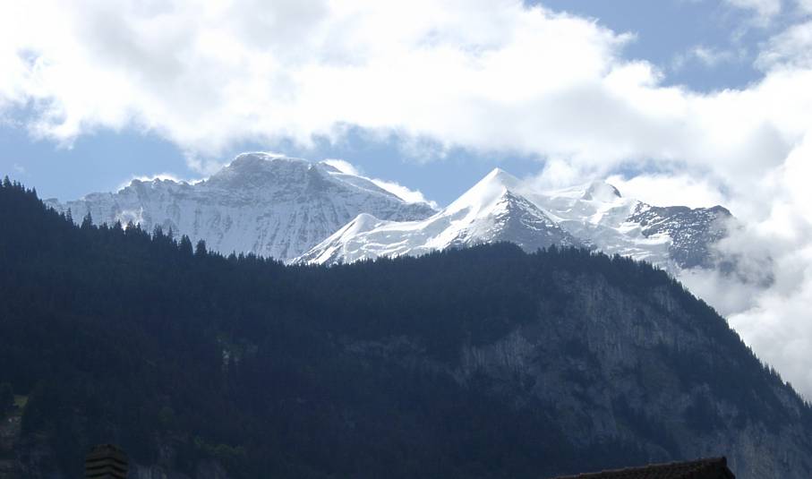 Über den Dächern von Lauterbrunnen die Jungfrau mit dem Silberhorn.