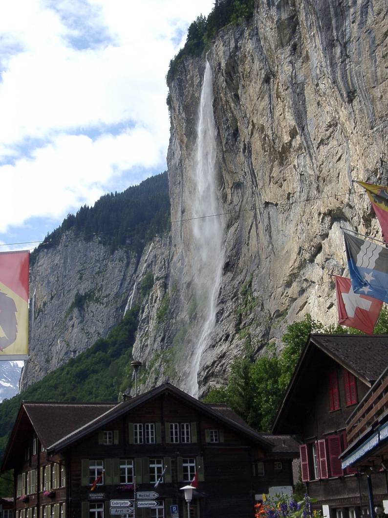 Und gleich über den Dächern von Lauterbrunnen der Staubbachfall.