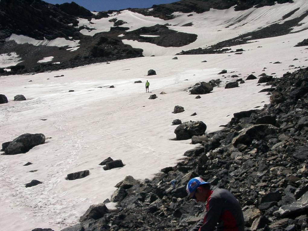 Dann rückt der Rote Totz schnell in weite Ferne. Auf dem Gletscher gibt es bereits im unteren Teil eine Wasserrinne, die den Wanderer kniehoch einbrechen läßt. Im großen Bogen nach oben kommt einer der Wanderer mit nassen Füßen wieder zurück. |
